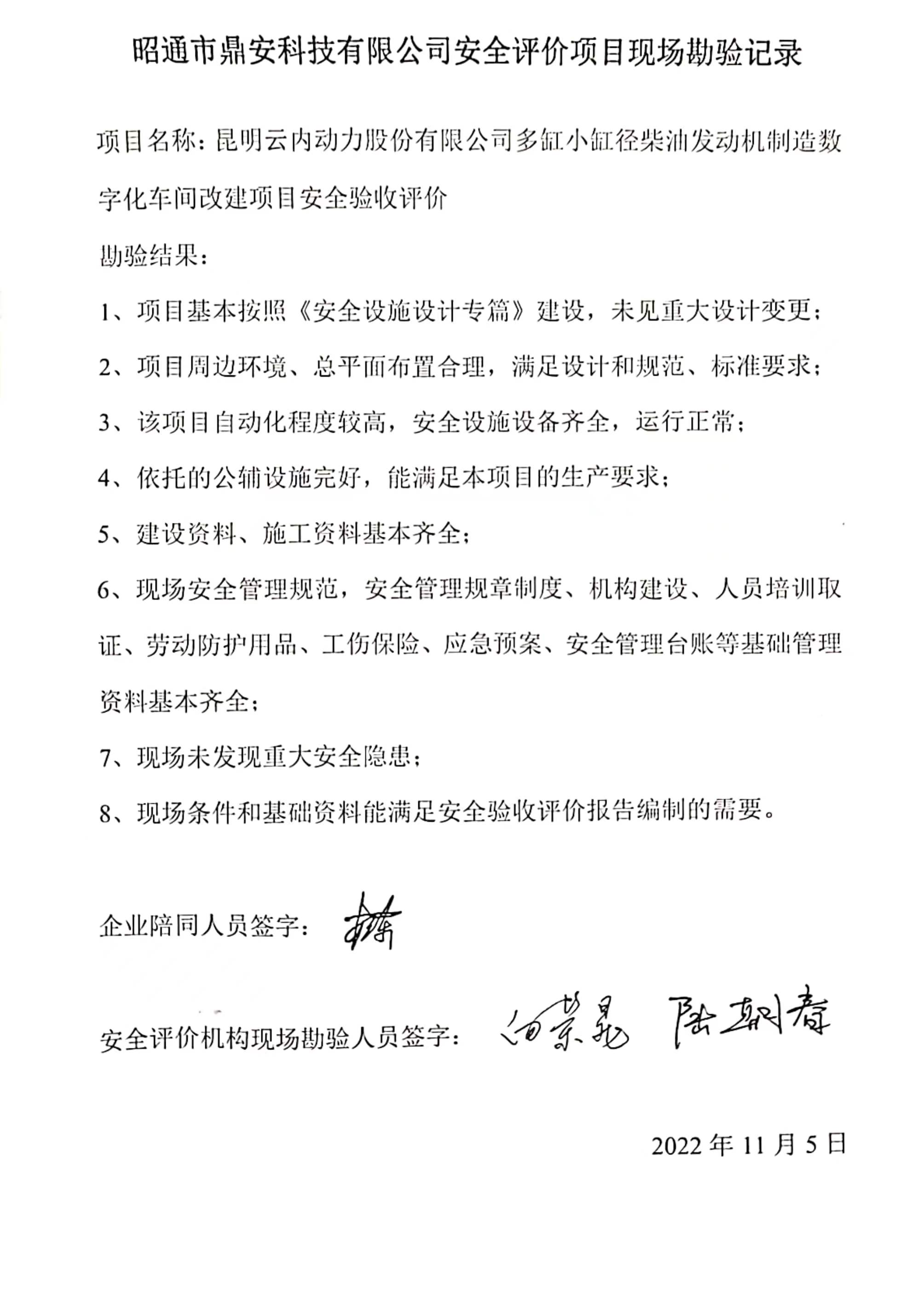 評價項目評價結論: 昆明云內動力股份有限公司多缸小缸徑柴油發動機制造數字化車間改建項目符合國家有關安全方面的法律、法規、標準、規程、規章的有關要求,本項目安全設施設計的規定得到貫徹和落實,具備安全驗收條件。 | ||||||||